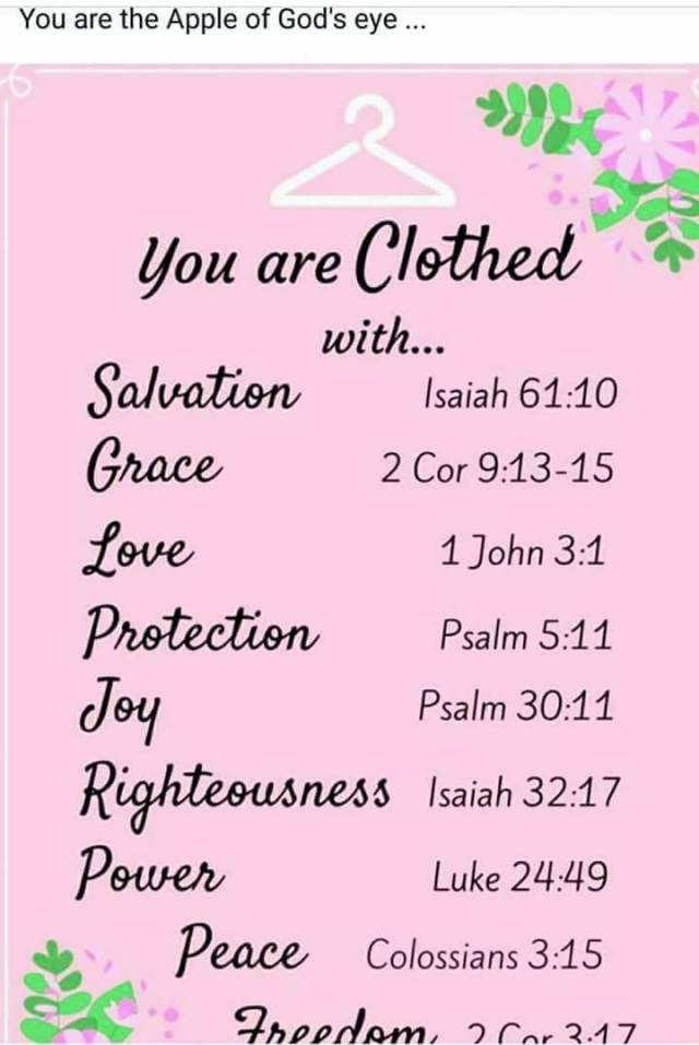 “I will rejoice greatly in the Lord , My soul will exult in my God; For He has CLOTHED me with garments of salvation, He has covered me with a robe of righteousness, As a bridegroom puts on a turban, And as a bride adorns herself with her jewels. For as the earth brings forth its sprouts, And as a garden causes what is sown in it to spring up, So the Lord God will [most certainly] cause righteousness and justice and praise To spring up before all the nations [through the power of His word].”(ISAIAH 61:10-11 AMP).