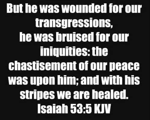 ” But he was wounded for our transgressions, he was bruised for our iniquities: the chastisement of our peace was upon him; and with his stripes we are healed.”(Isaiah 53:5 KJV).